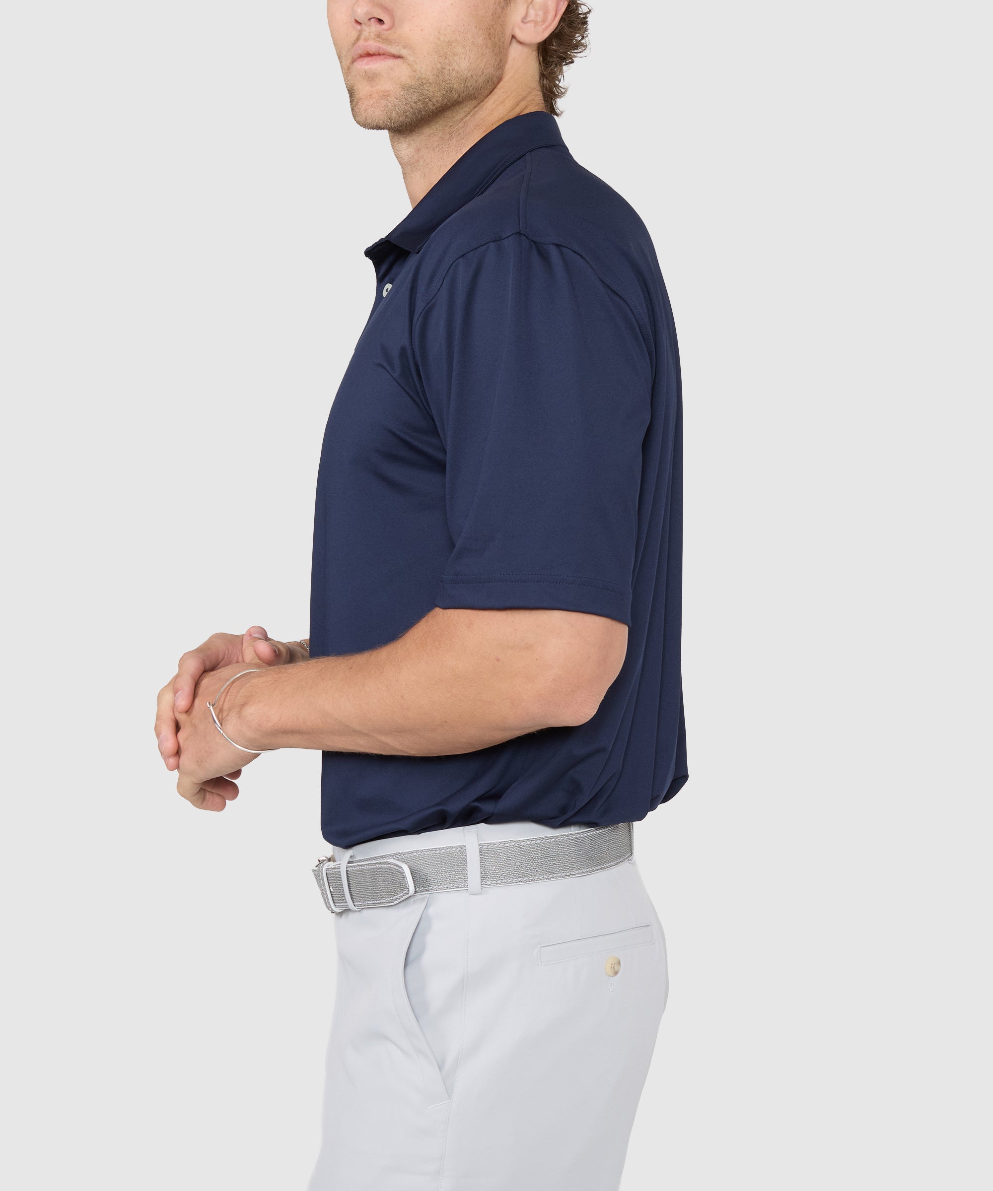 A polo shirt like this one from Westport Lifestyle will be one you come back to time and time again this spring. Other items in your wardrobe may be flashier, dressier or one-trick ponies; ones that have specific purposes. This one is a workhorse. Day after day it'll be called upon to do the heavy lifting and it will perform beautifully. It's down to the performance fabric that it's made of. It has stretch and keeps you cool and dry. It adds a little bit of character when worn under a similarly constructed vest or pullover. Worn on its own it evokes clean, straight lines and a minimal aesthetic. A great choice.