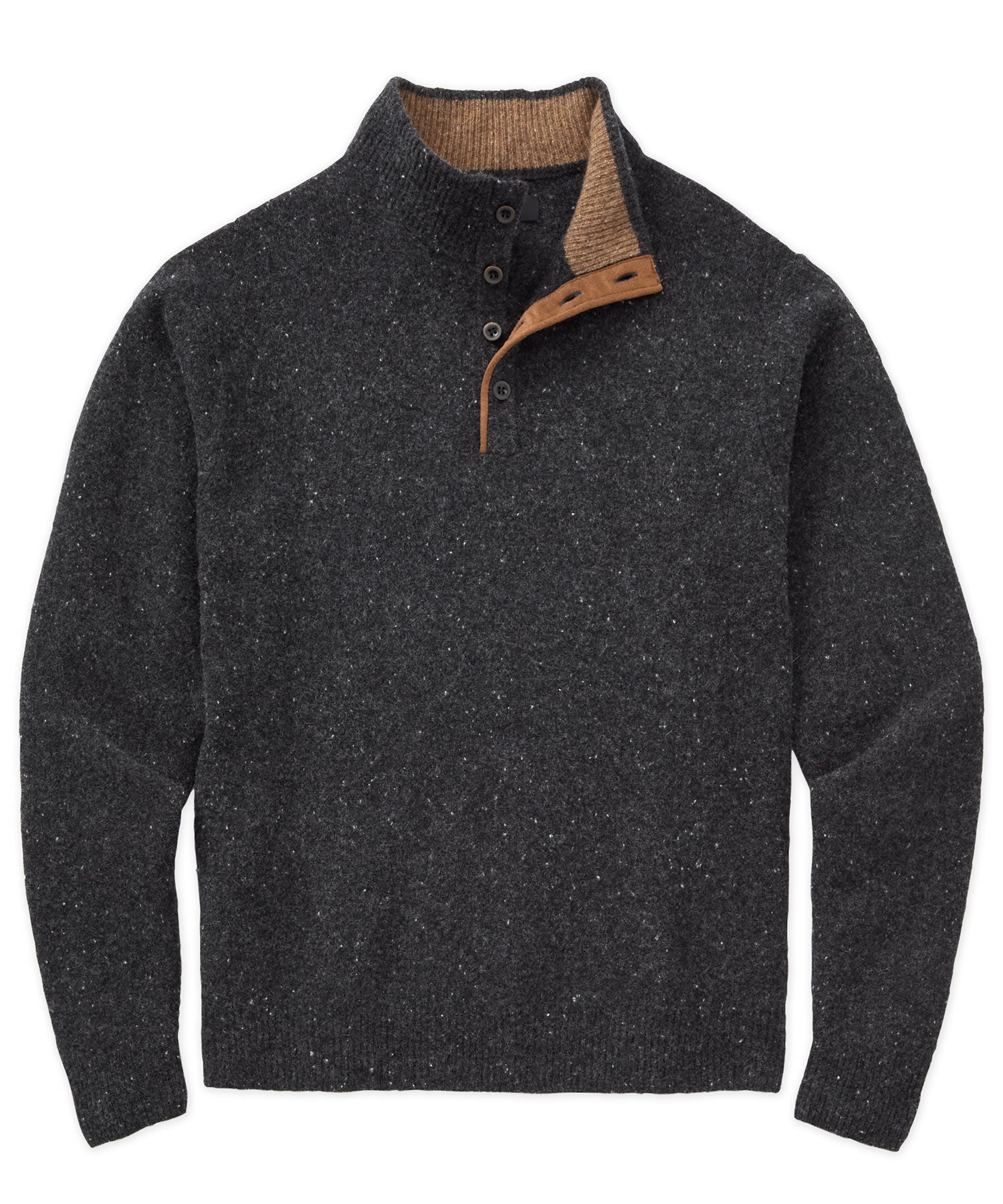 This big and tall sweater is sure to become a signature piece in the fall and winter wardrobe. It has a uniquely singular silhouette thanks to its four-button placket resplendent with suede detailing. Ribbed openings help to retain the sweater's shape. The interior collar holds a pop of contrast color that can uplift a sport shirt worn against it and add an air of sophistication to the overall look. The subtle Donegal pattern gives it an old-world vibe and a countryside appeal.
