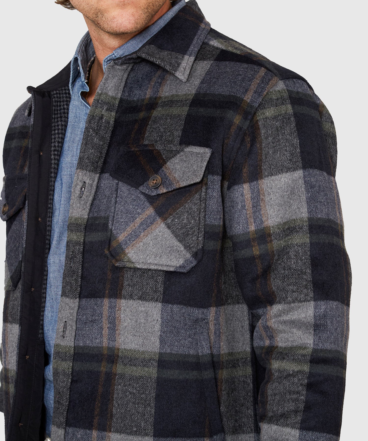 It can go by overshirt or shirt jacket but whatever it gets called one thing is for sure: it's an undeniable essential in every man's closet. It has a wide range of uses and comes in varying weights and fabrications. This one is a classic houndstooth pattern and is made of a wool blend. It'll provide maximum warmth and comfort against inclement days. It's also a stylish addition to any casual outfit capping off a perfectly layered look.