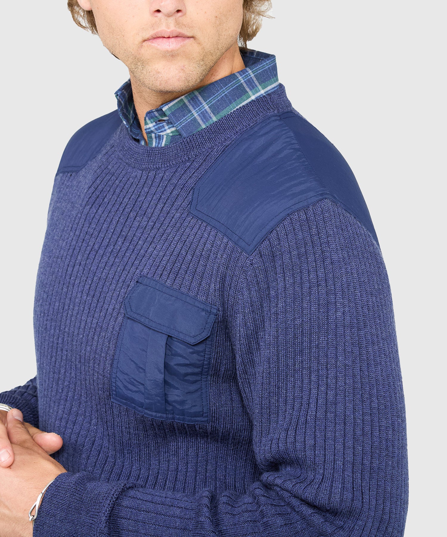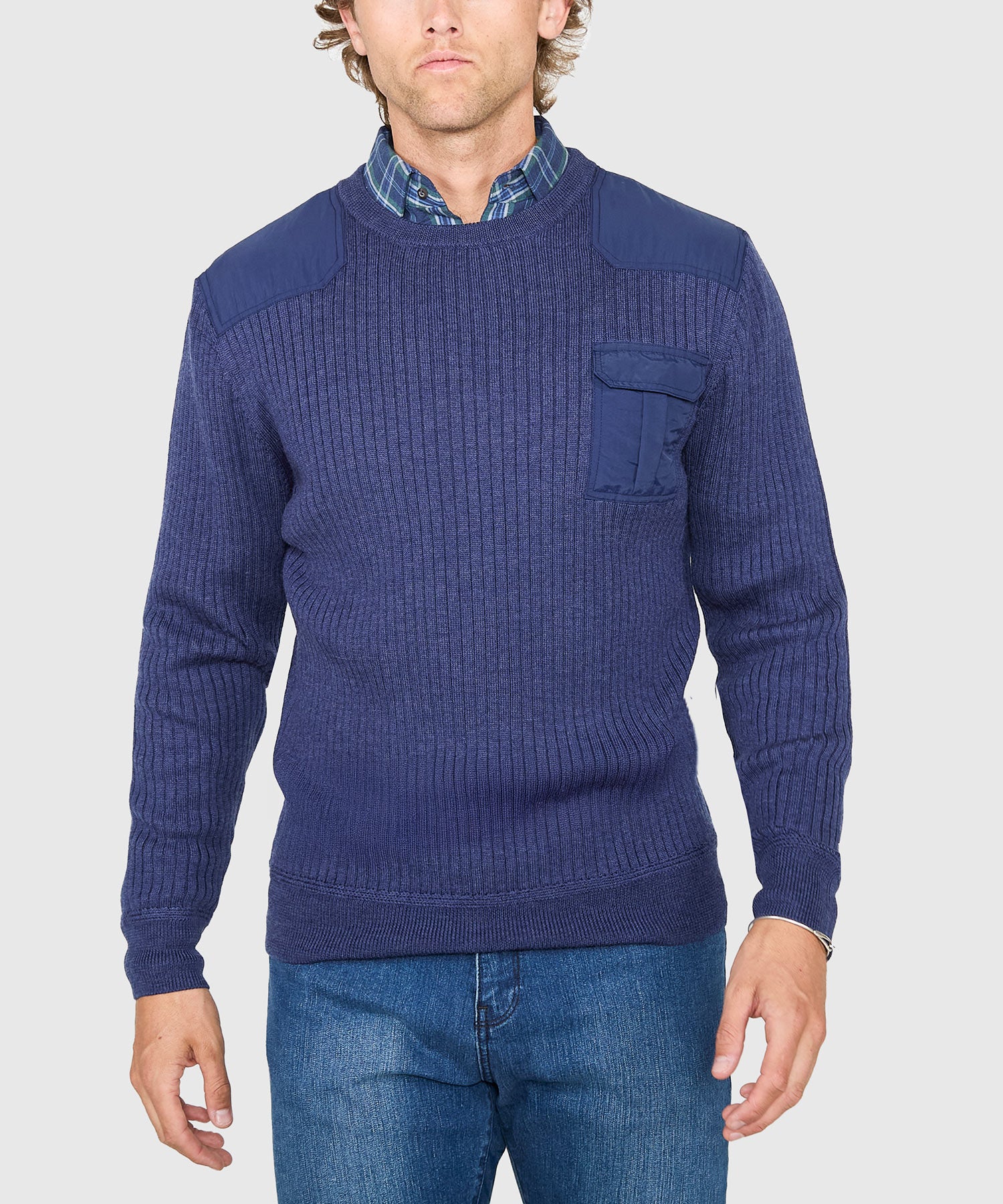 Inspired by the sweaters worn by British commandos, this big and tall sweater keeps it classic with a crew neck collar. It also has a patch pocket on the chest just for good measure. Merino wool makes this an superbly breathable garment with a soft hand.