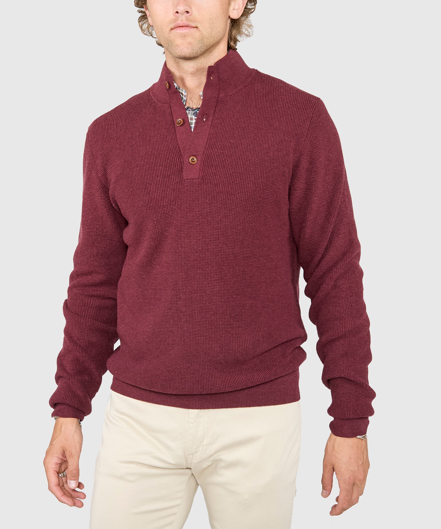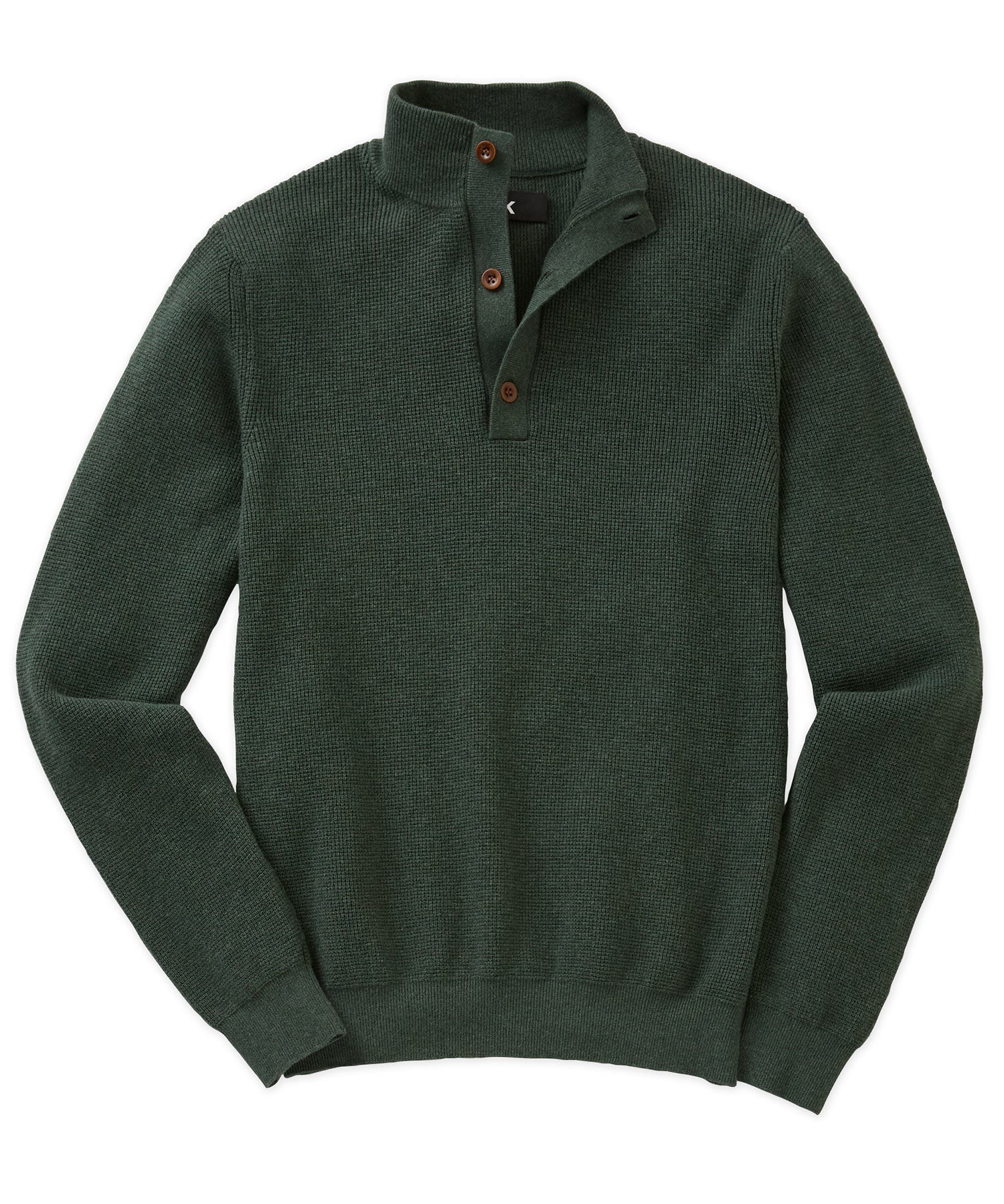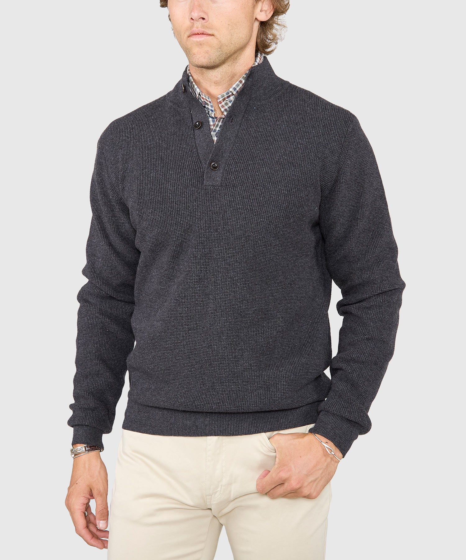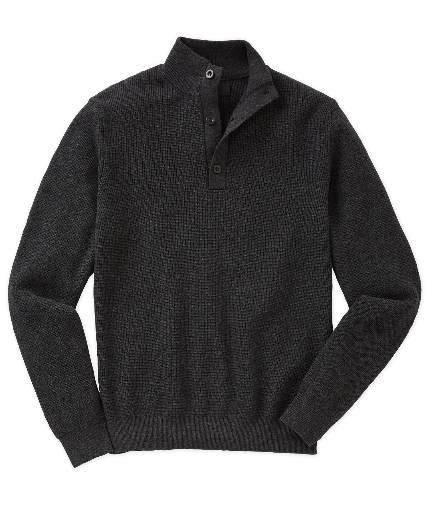 This big and tall sweater blends together two fabrics that can be construed as on opposite sides of the spectrum. Cotton is clearly a common fabric for most garments, coveted for its many benefits. Cashmere, on the other hand, is often considered a fabric of luxury and one that is not nearly as prevalent. When they are combined they create a garment that has the breathability and durability of cotton fused with the supremely soft and luxurious hand of cashmere. The mock-style collar is a protective one, providing cover and warmth and the button closure has an alpine allure to it. Pairing it with a complimentary t-shirt underneath gives the wearer the option of introducing a splash of color into the look.