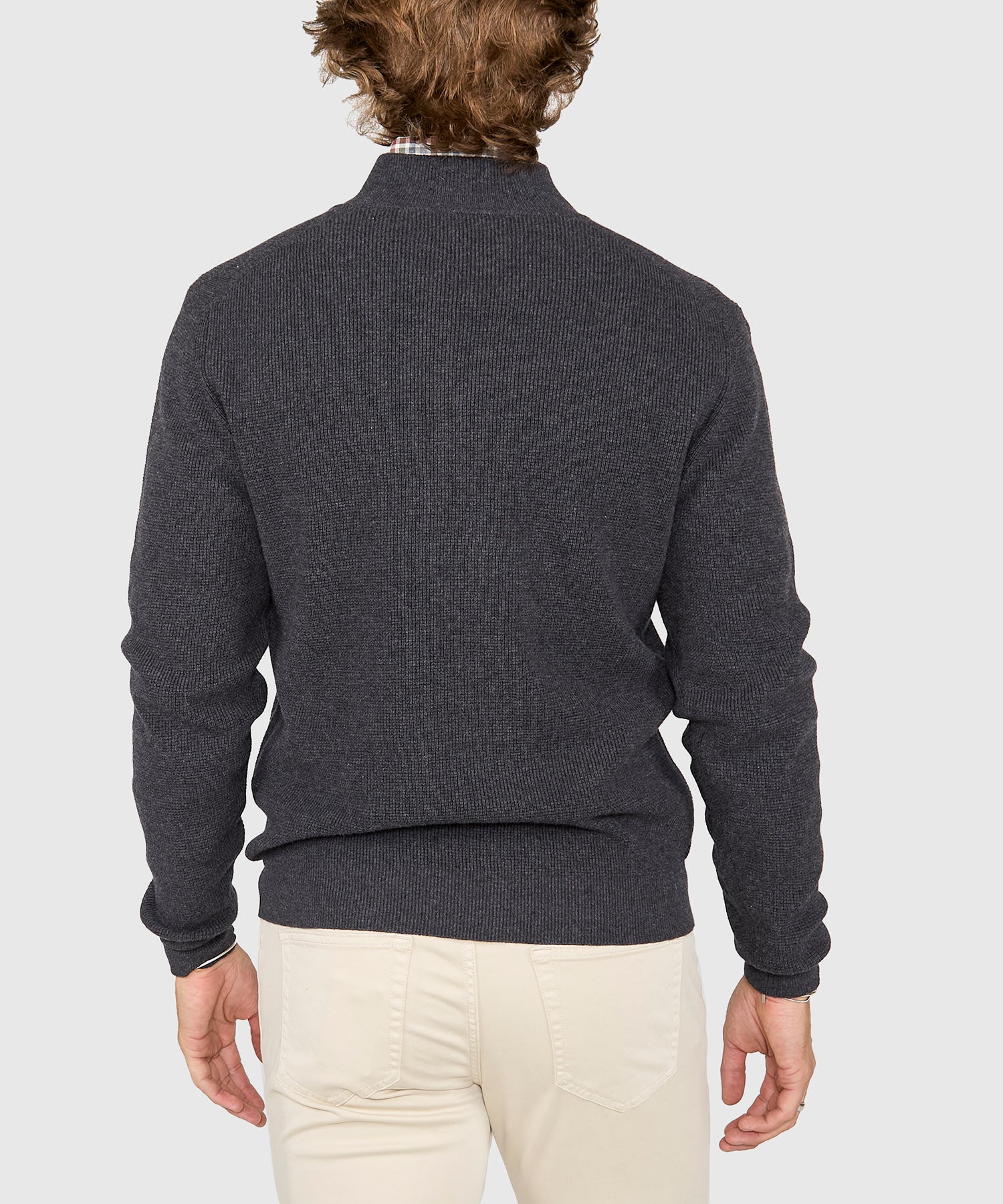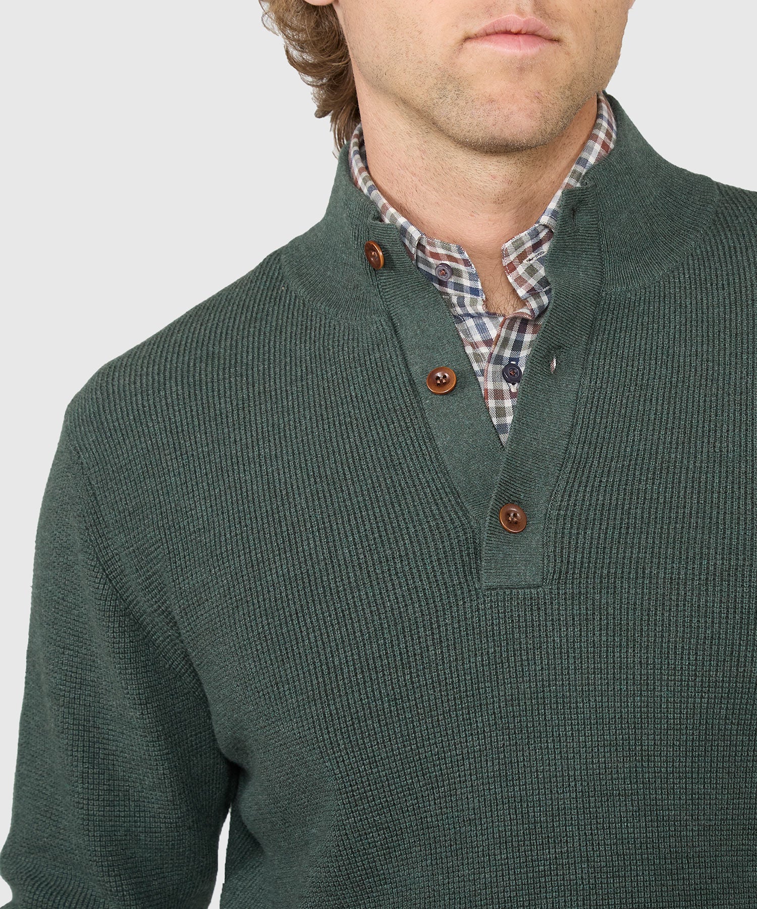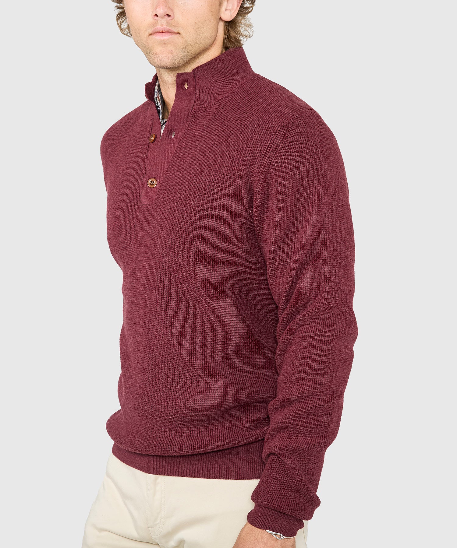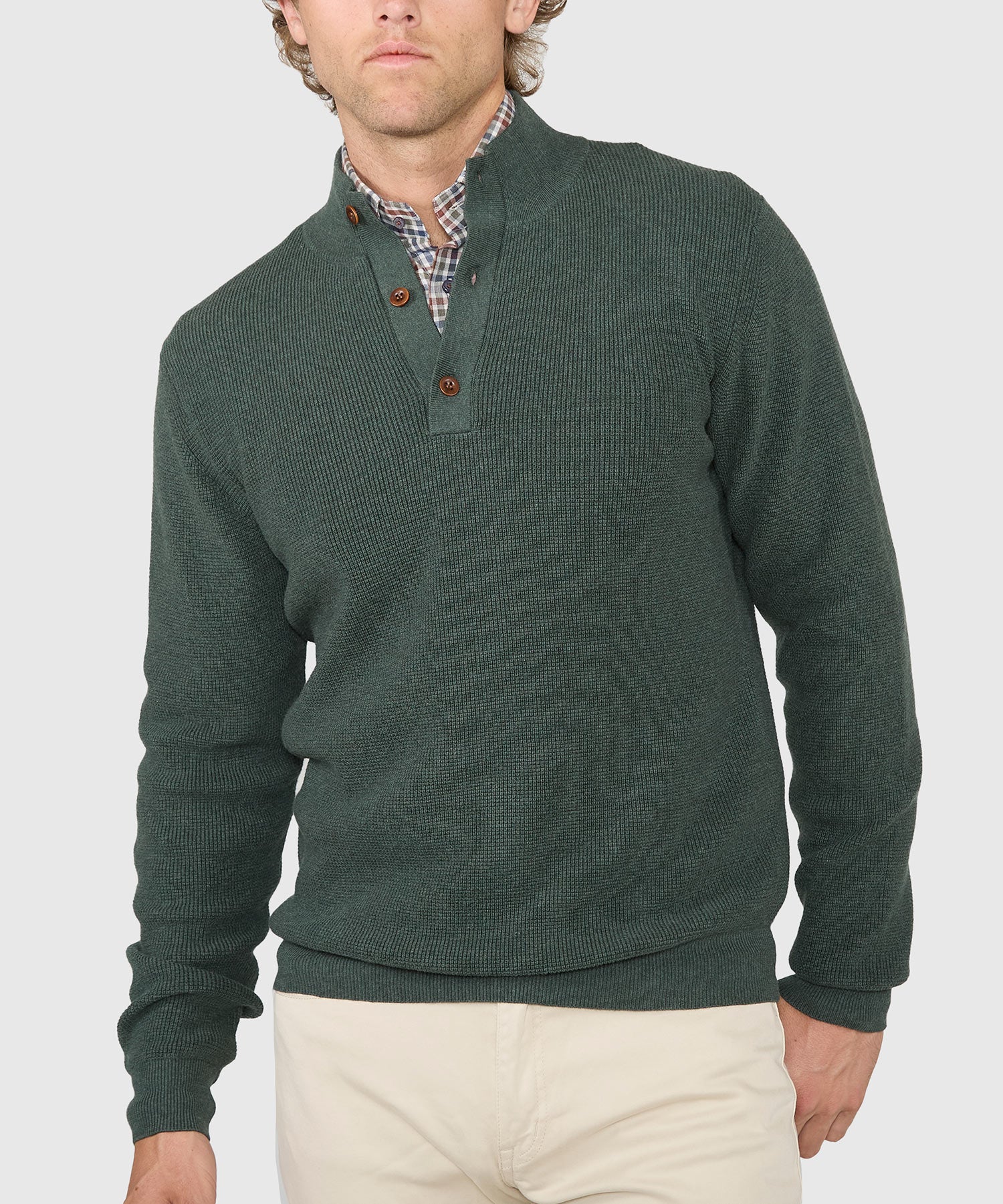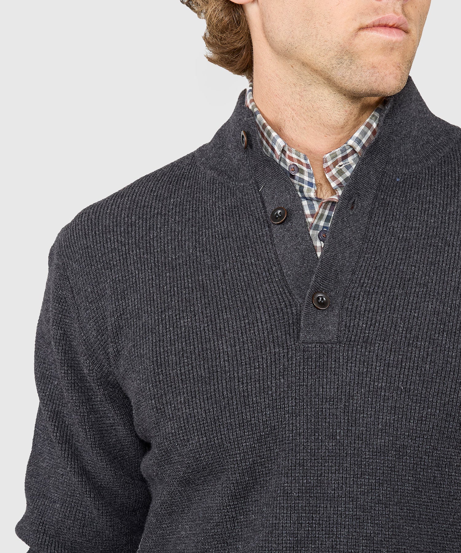This big and tall sweater blends together two fabrics that can be construed as on opposite sides of the spectrum. Cotton is clearly a common fabric for most garments, coveted for its many benefits. Cashmere, on the other hand, is often considered a fabric of luxury and one that is not nearly as prevalent. When they are combined they create a garment that has the breathability and durability of cotton fused with the supremely soft and luxurious hand of cashmere. The mock-style collar is a protective one, providing cover and warmth and the button closure has an alpine allure to it. Pairing it with a complimentary t-shirt underneath gives the wearer the option of introducing a splash of color into the look.