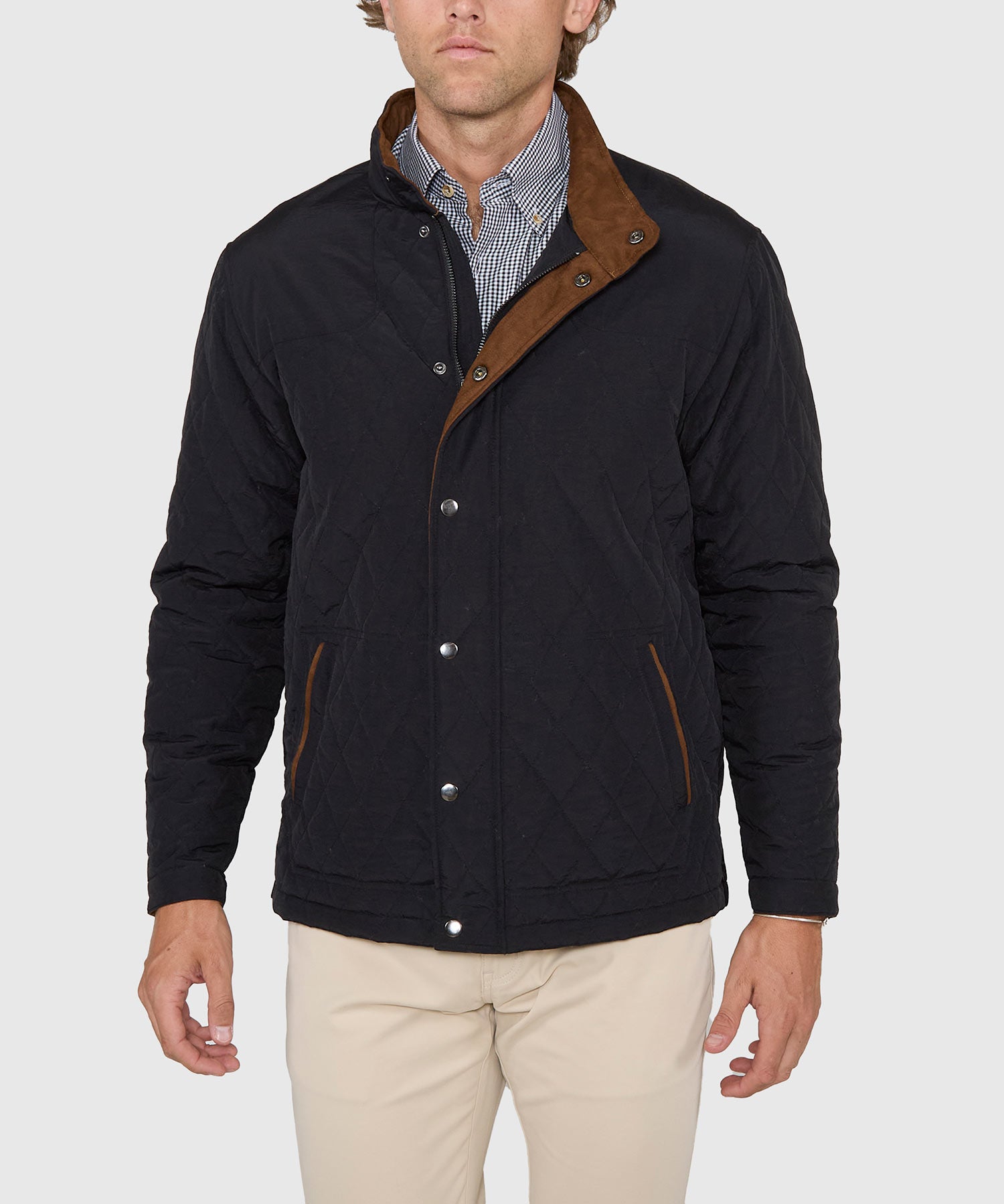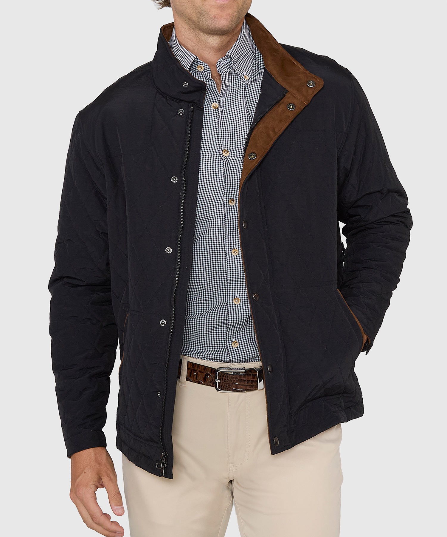 This big and tall jacket's look has its origin in traditional outdoorsman sportswear. It gets an update with a more modern performance fabrication that enhances the elements of comfort and mobility while on the go. It features an elegantly quilted exterior capped off with its namesake shooter shoulder patches. Suedette detailing adds accent to the side pockets and collar interior. It may have countryside beginnings but its elevated ruggedness is at home just about anywhere.