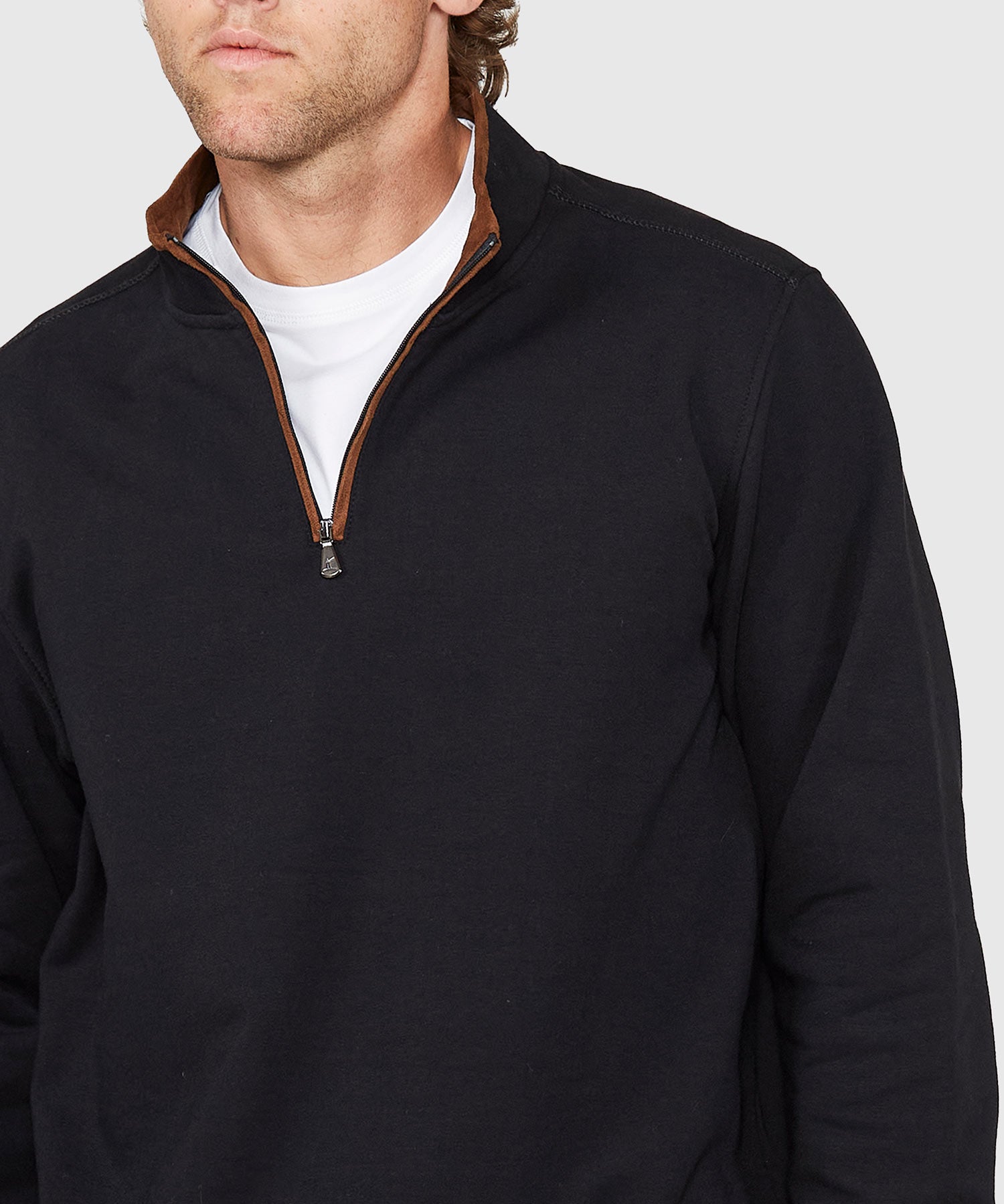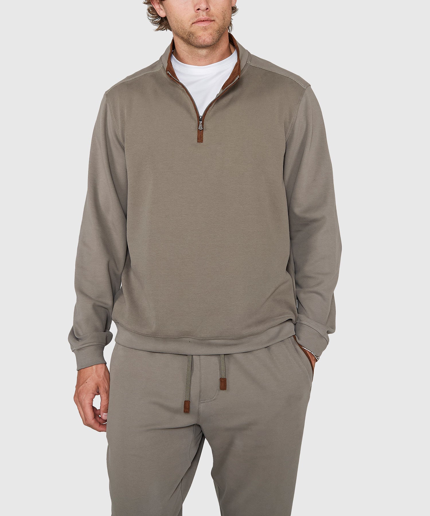 This big and tall pullover is a sleek layering piece made from a cotton rich fabric equipped with stretch and a soft hand. It's a lightweight way to add a little bit of layering without overdoing it. It's squarely in the mold of other styles in the burgeoning athleisure category and will definitely garner some attention. Tasteful suedette trim adorns the zip placket and the interior of the collar. It can be worn on its own but looks best when paired up with its matching bottom (#43197).