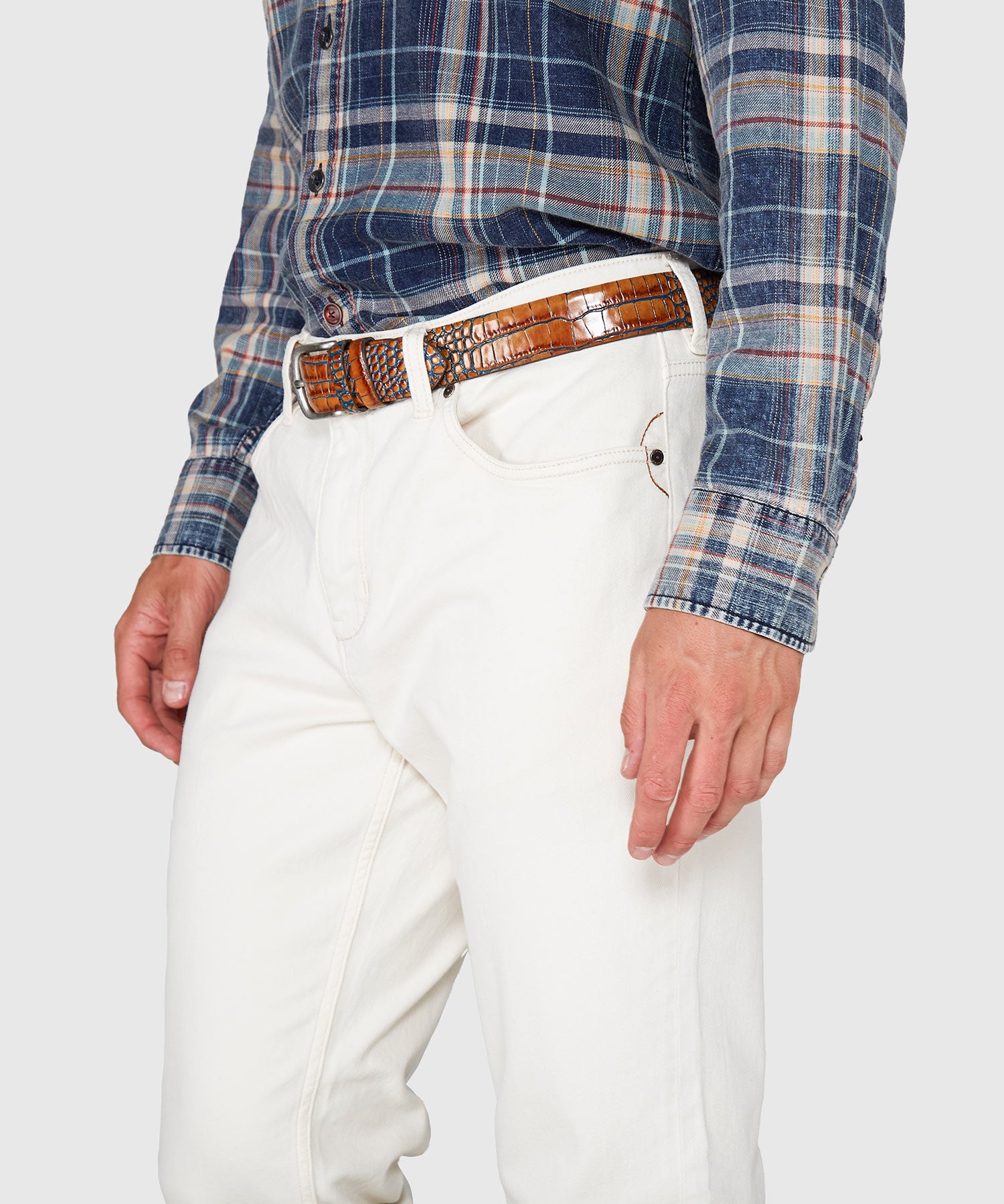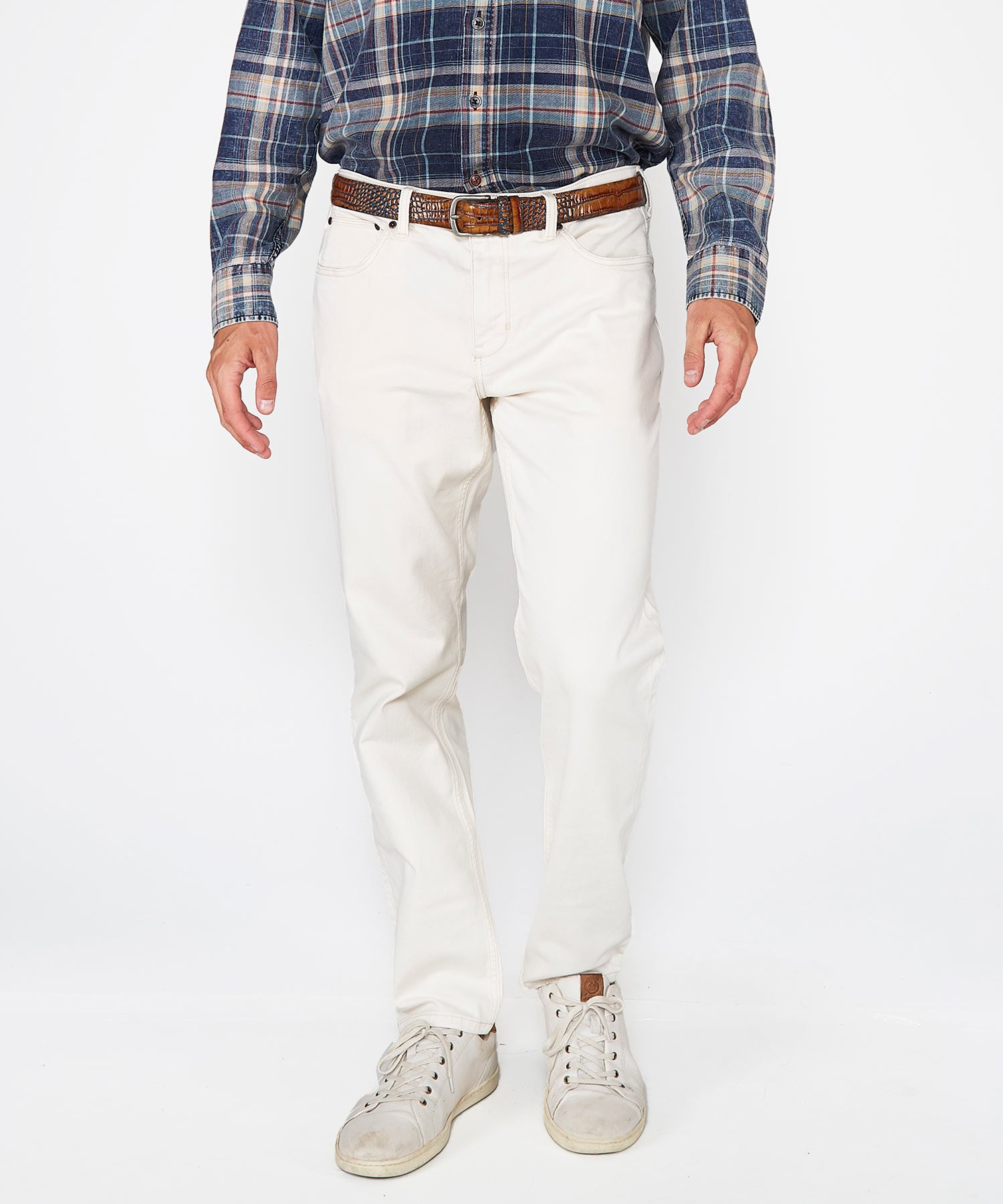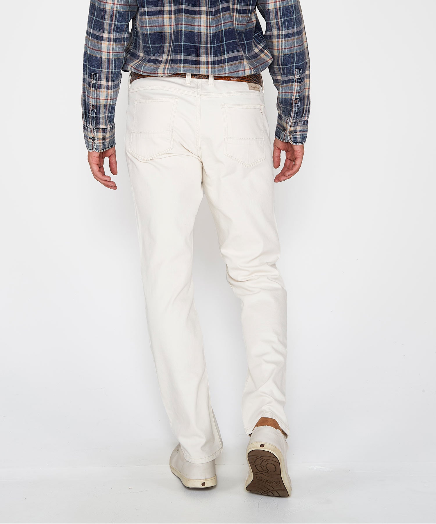 • Belt loops. Shank button closure with zip fly