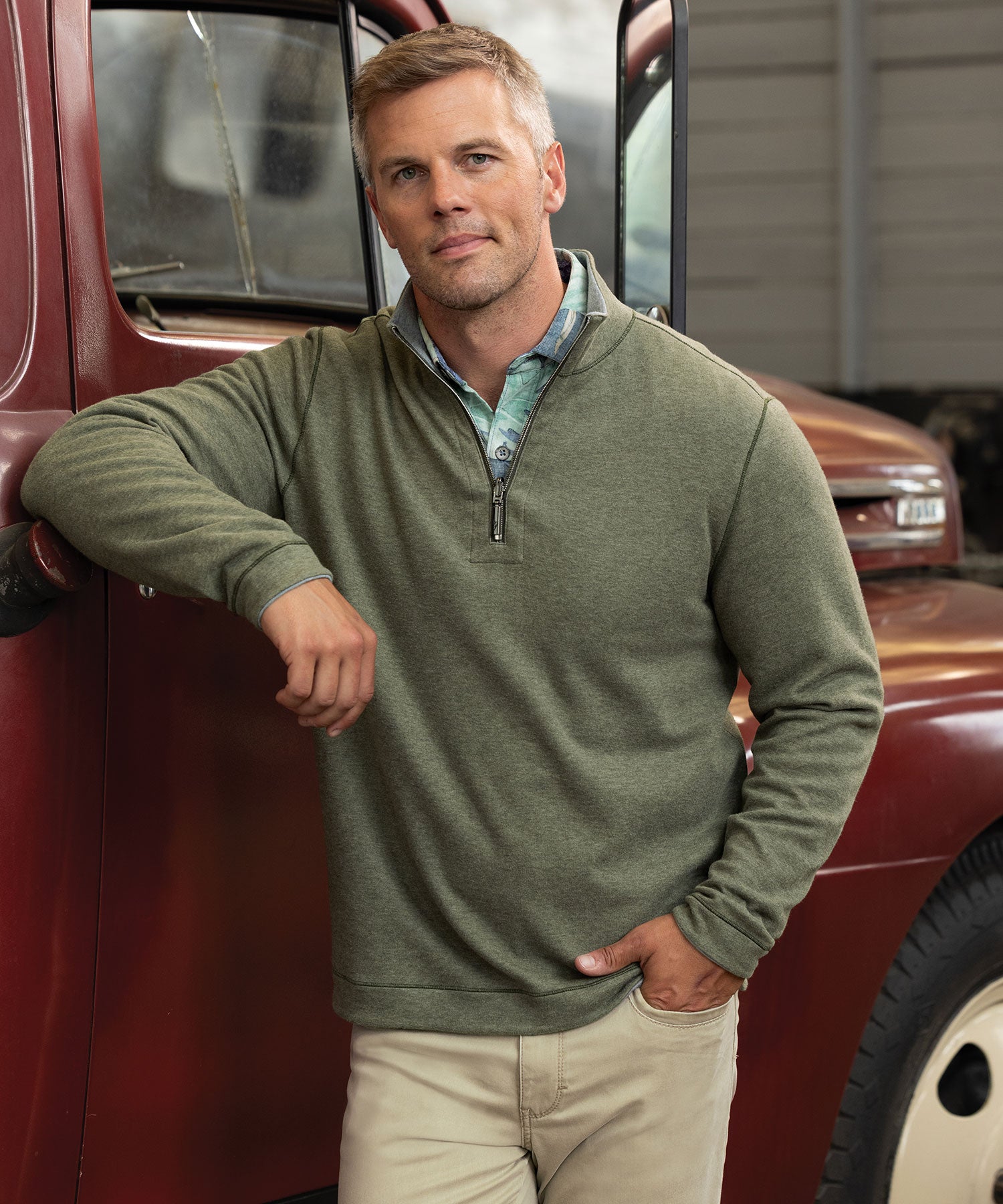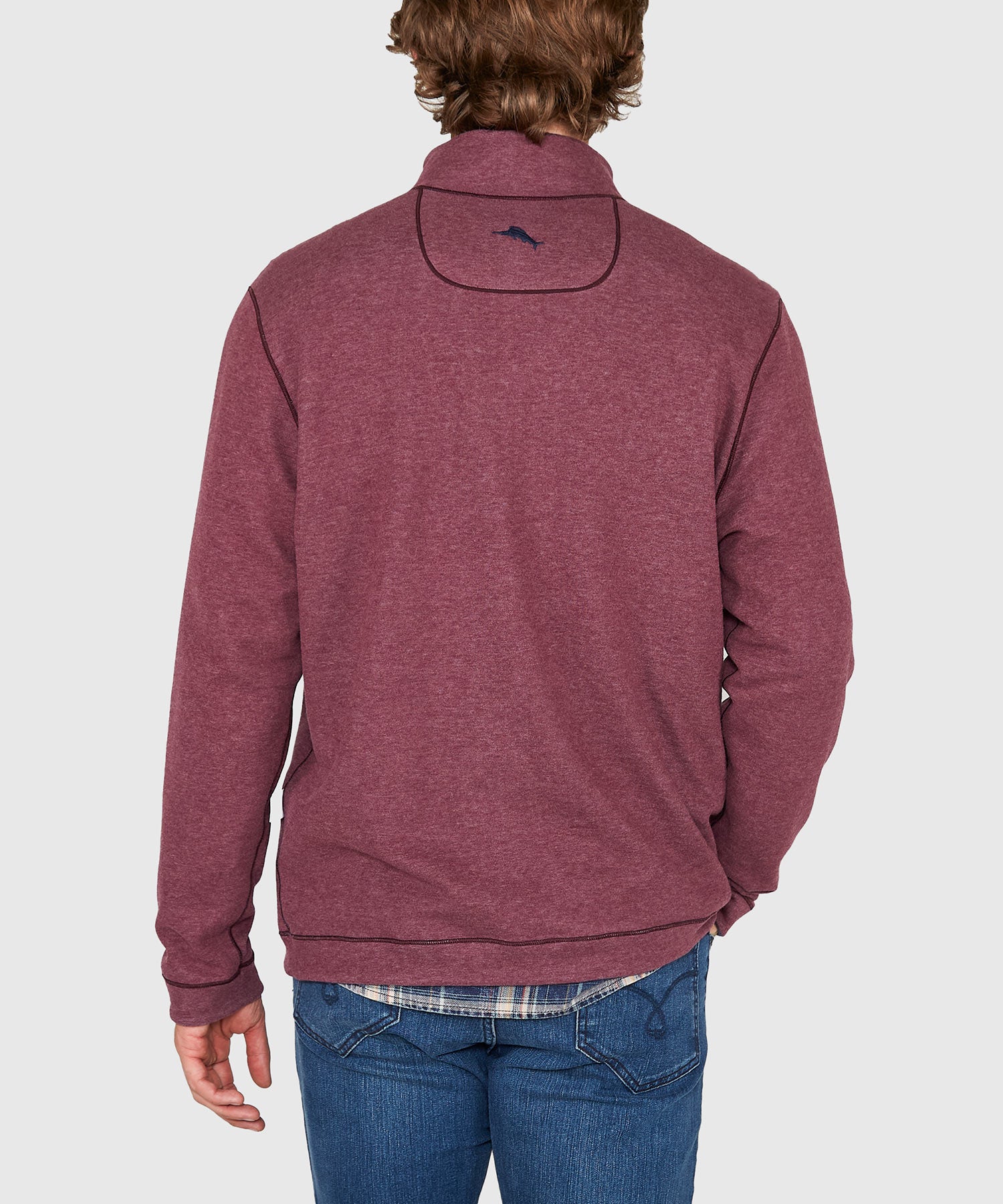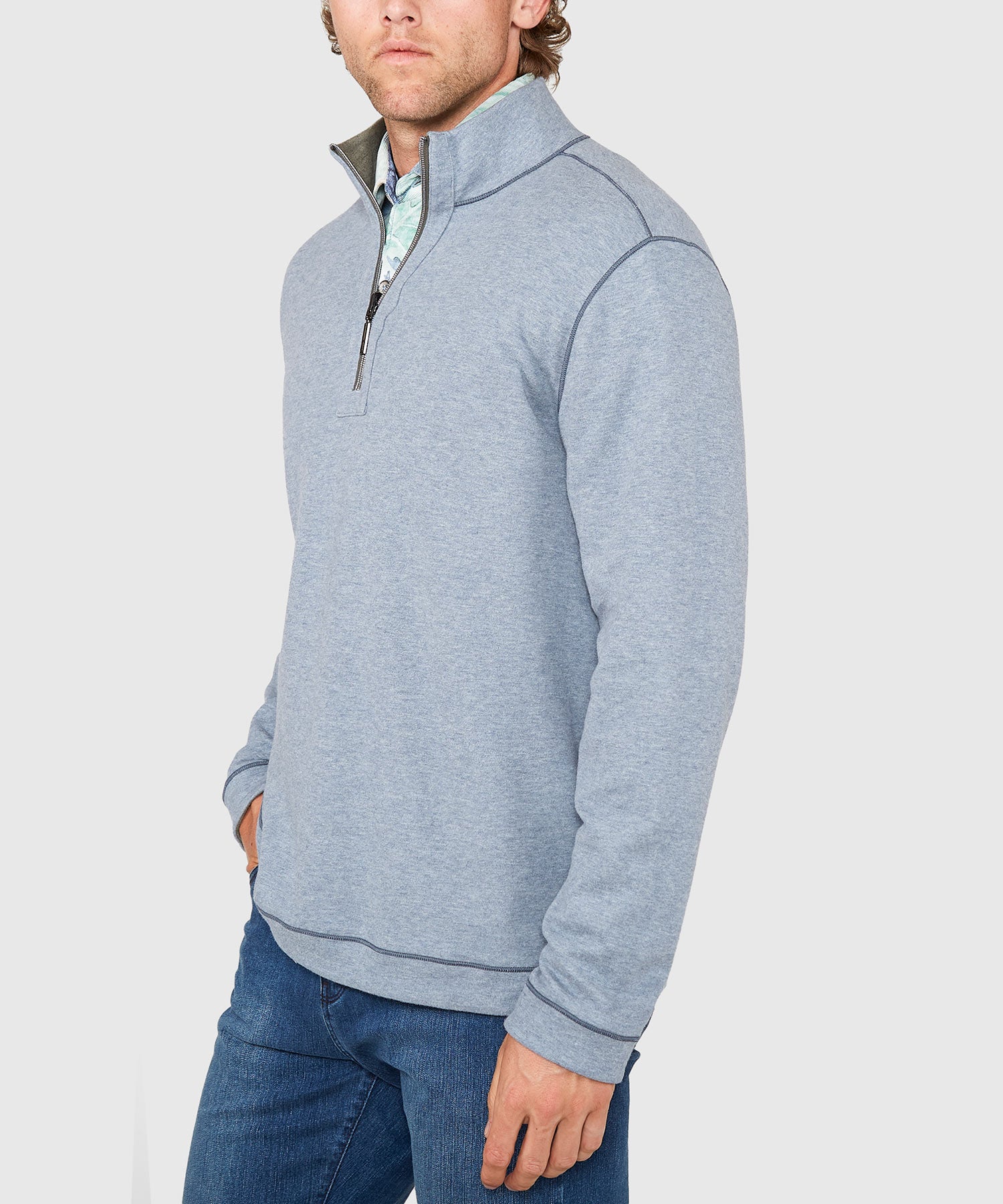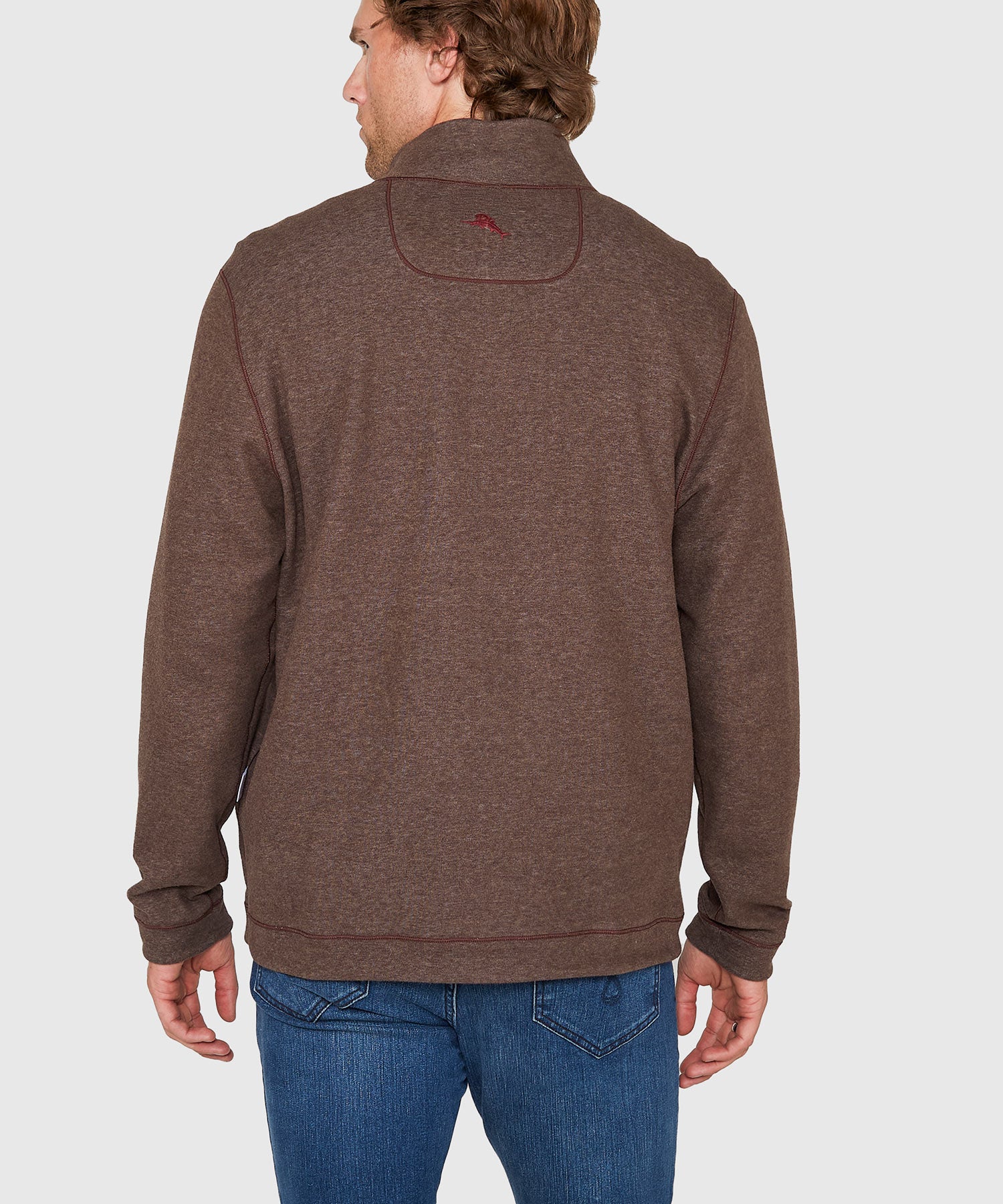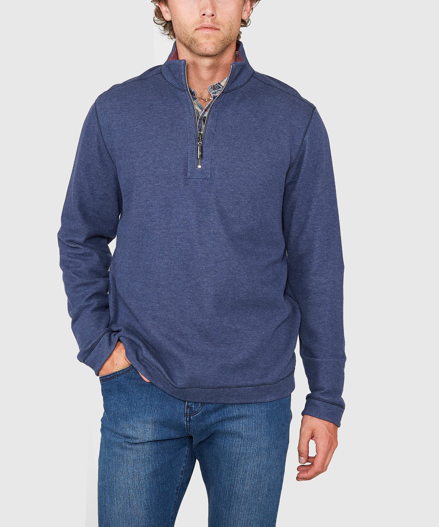 Tommy Bahama does it again with two half-zips in-one. This big and tall pullover is fully reversible and ready for you to change your look up at a moment's notice. Additionally it's got to be one of softest layering pieces around. Rich cotton pairs with modern performance materials to offer some comfort-enhancing stretch. Cover stitch detailing throughout also adds a touch of rugged style.