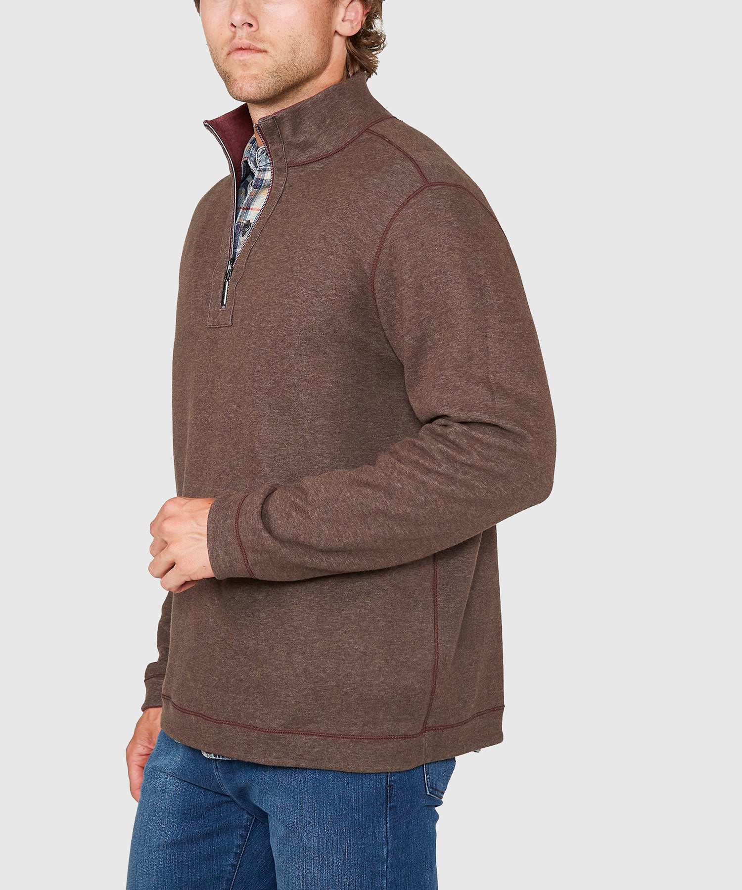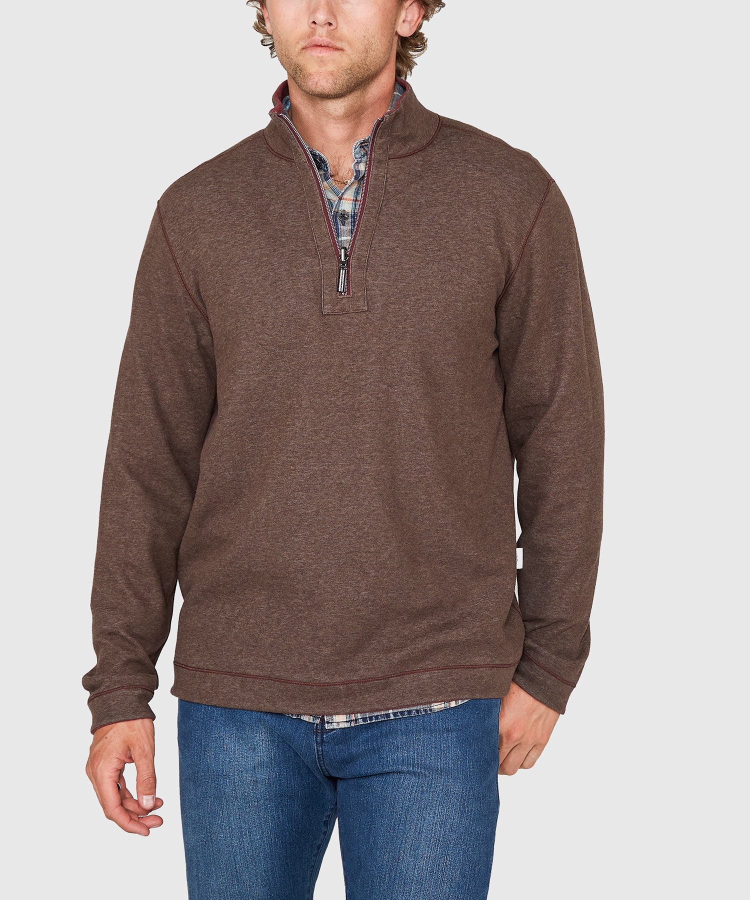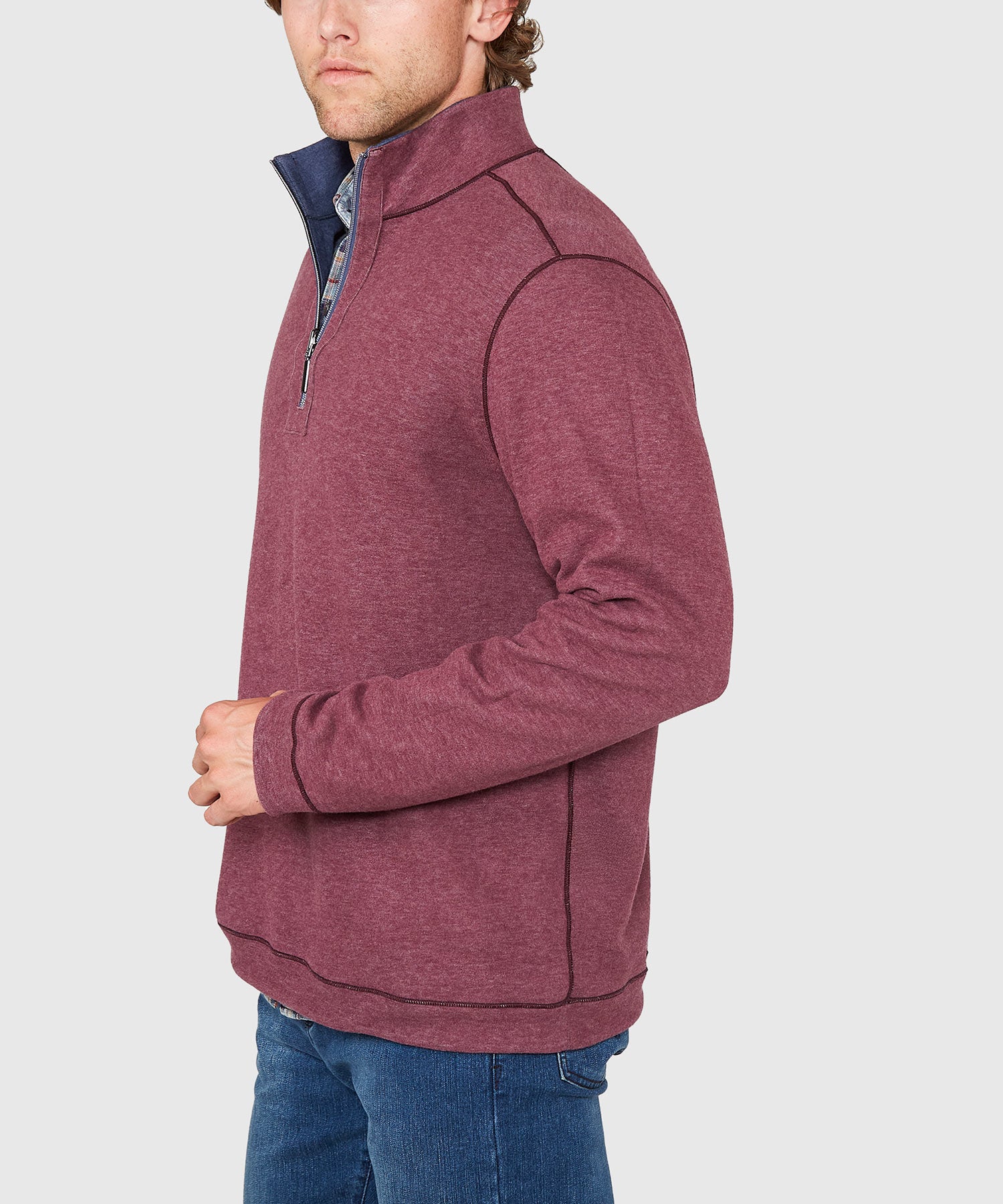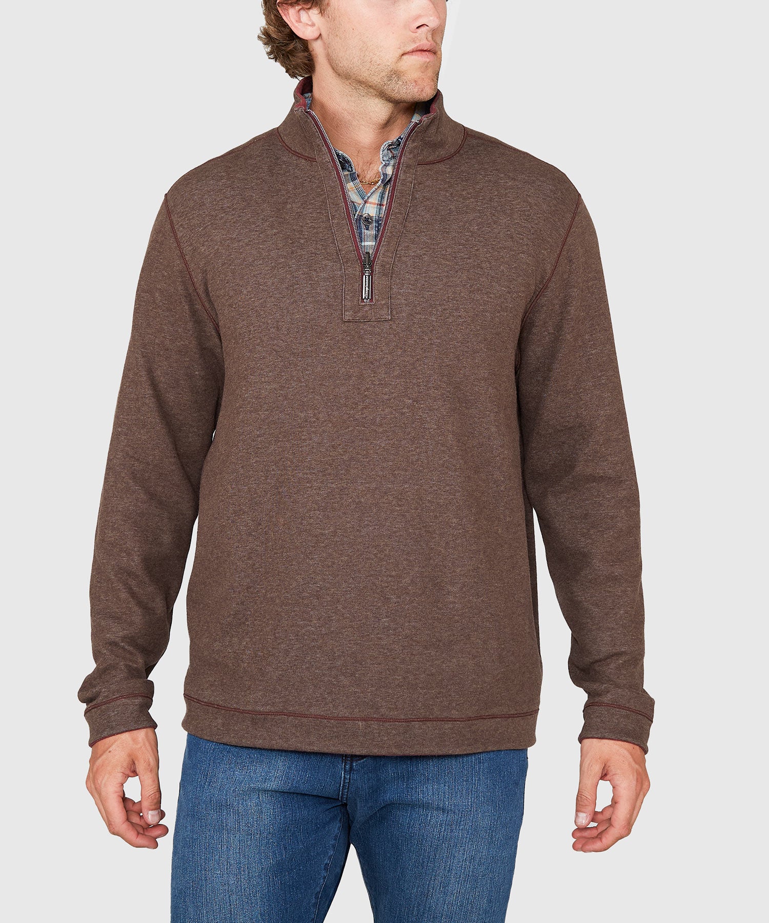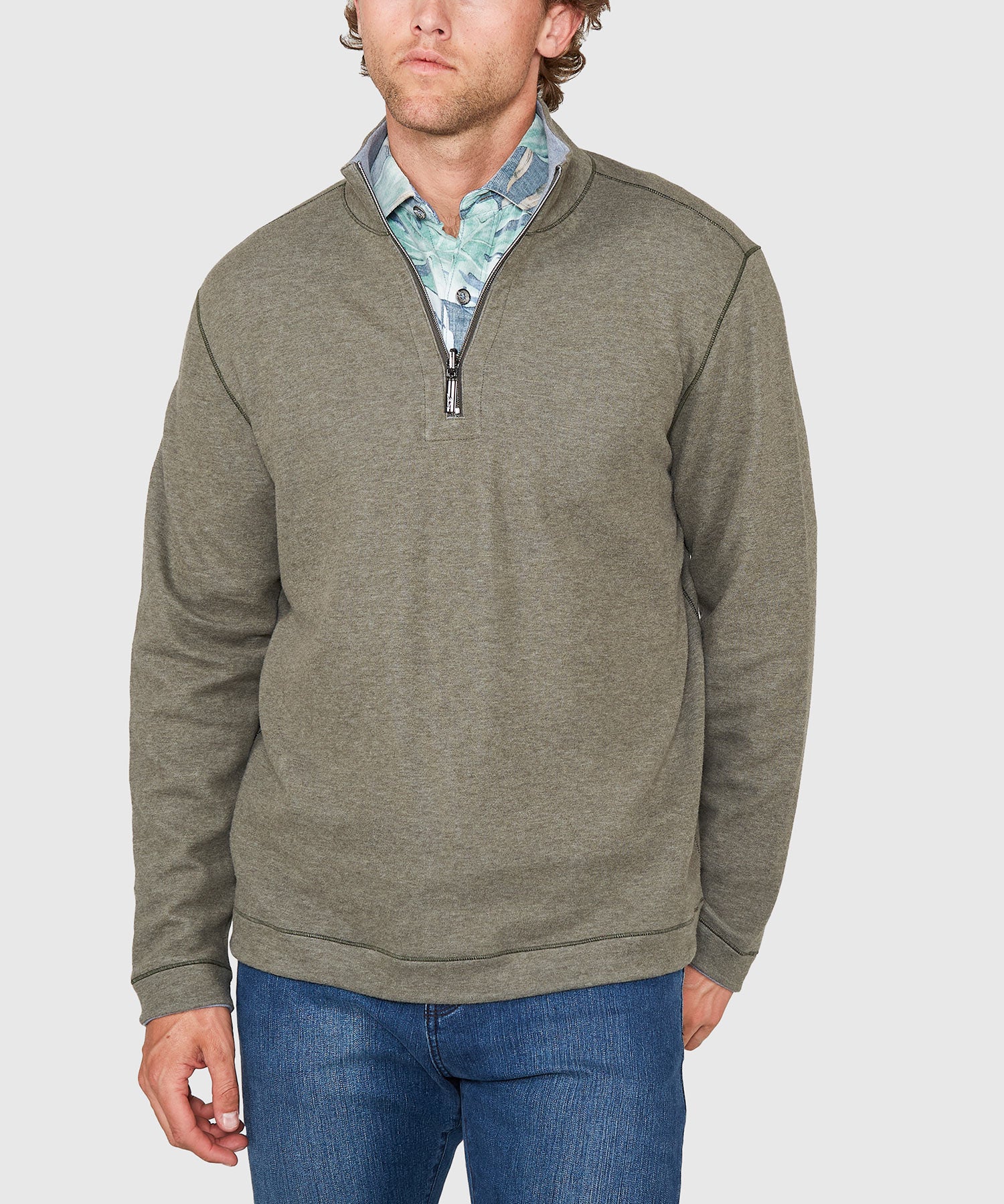 Tommy Bahama does it again with two half-zips in-one. This big and tall pullover is fully reversible and ready for you to change your look up at a moment's notice. Additionally it's got to be one of softest layering pieces around. Rich cotton pairs with modern performance materials to offer some comfort-enhancing stretch. Cover stitch detailing throughout also adds a touch of rugged style.