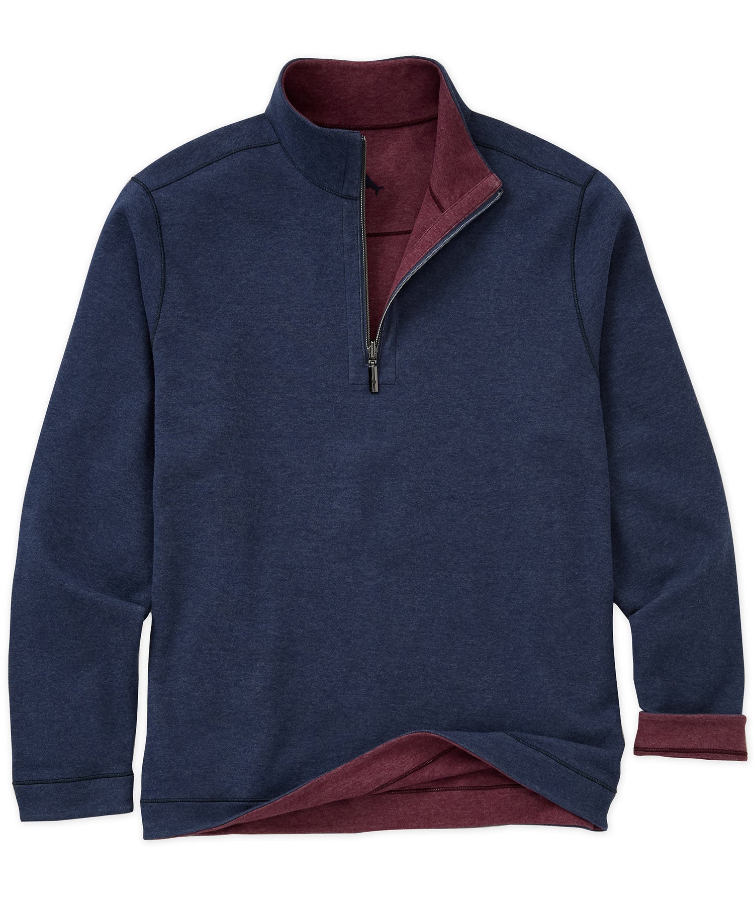 Tommy Bahama does it again with two half-zips in-one. This big and tall pullover is fully reversible and ready for you to change your look up at a moment's notice. Additionally, it's got to be one of softest layering pieces around. Rich cotton pairs with modern performance materials to offer some comfort-enhancing stretch. Cover stitch detailing throughout also adds a touch of rugged style.