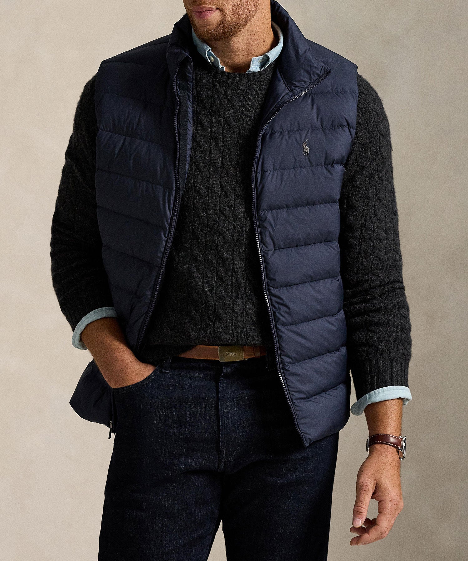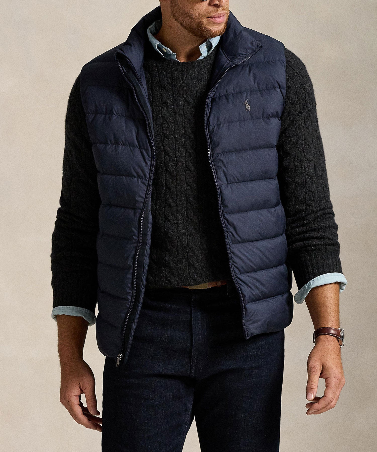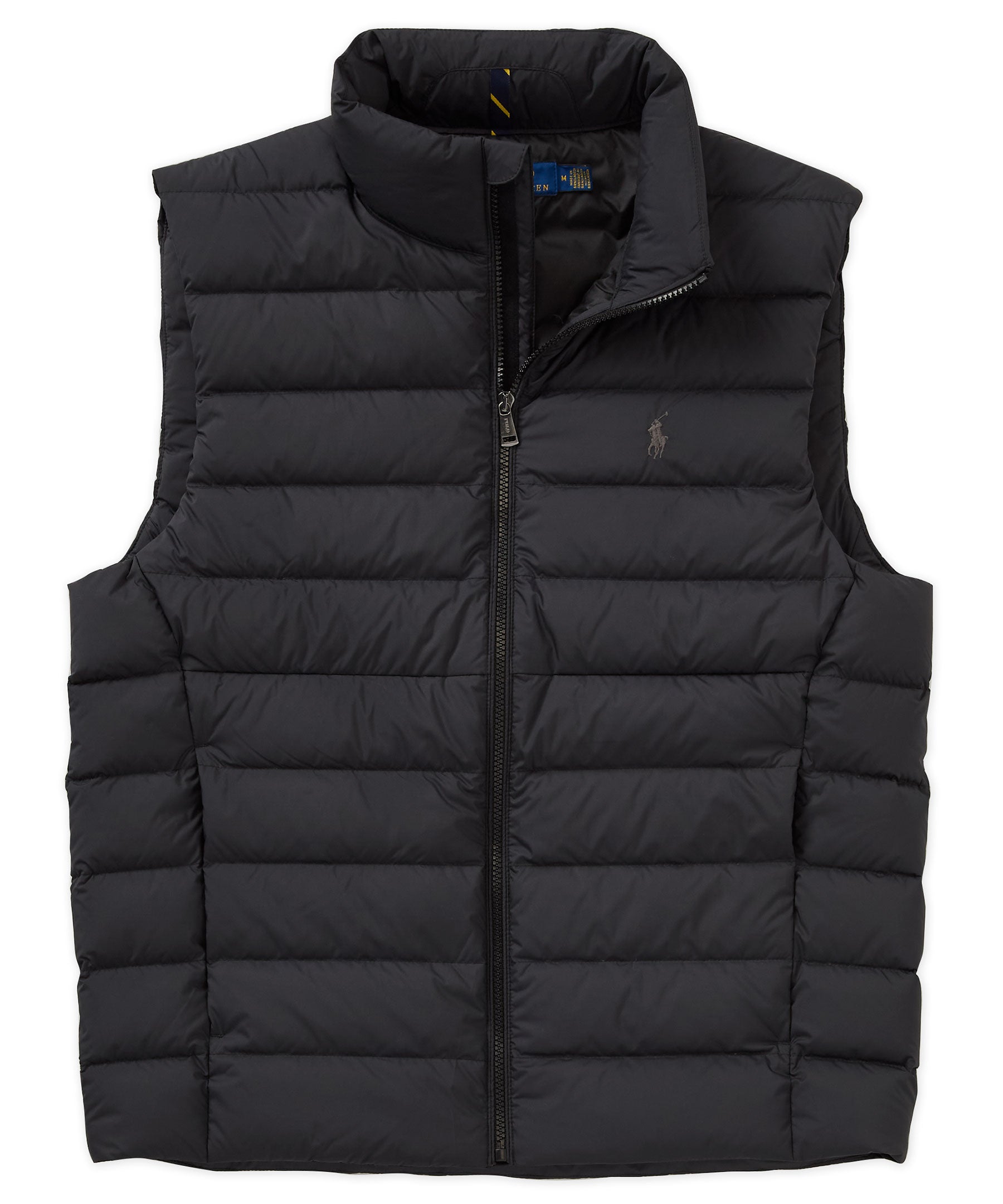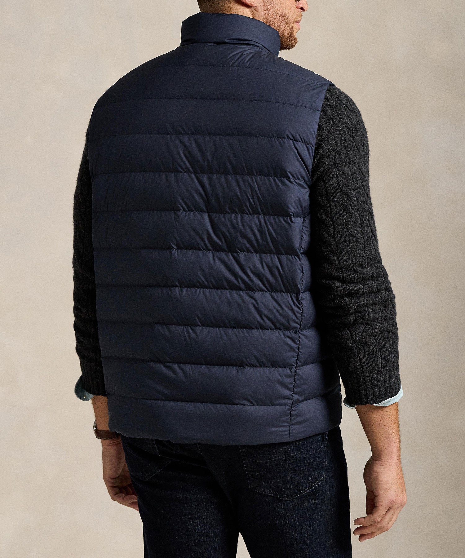 What's better than a reliable piece of outerwear that packs up into a easily portable one as well? This big and tall vest from Polo Ralph Lauren is just that; a valuable layering piece that can be folded into a pouch when not in use. It's loaded with details and appointments: elasticized armholes built for comfort and a drawstring hem. Coupled with a full zip front and a mock neck collar, this big and tall vest is well-equipped to keep you warm at a moment's notice. It's duck down and feathers fill is encased in a water-repellent performance fabric. Additionally, it has waist height front pockets to likewise keep belongings safe.