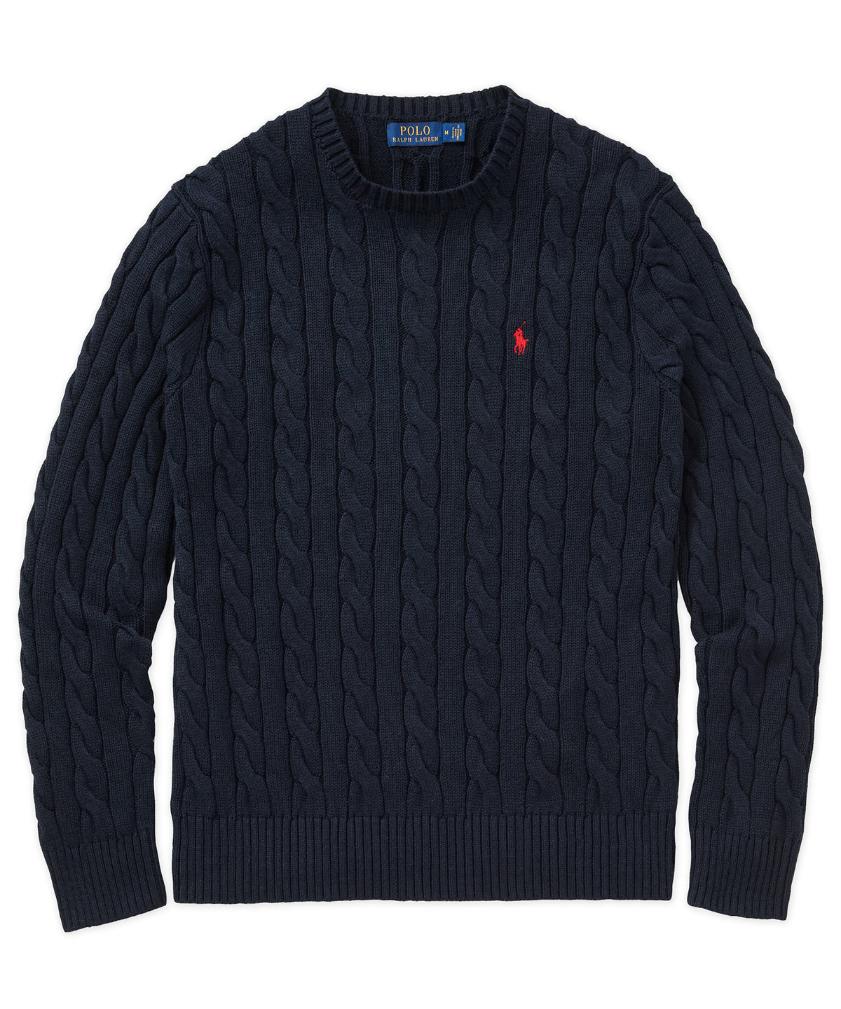 Like many of Polo Ralph Lauren's garments, this cotton cable sweater is an archetypical example of classic styling, form and function. It has a classic crew neck collar and ribbed cuffs and bottom hem. It's preppy by nature and has more than a nod toward the traditional. That being said, it also can be employed in a more modern way by pairing it smartly with printed sport shirts, richly-colored tees and every bottom from chinos to jeans.
